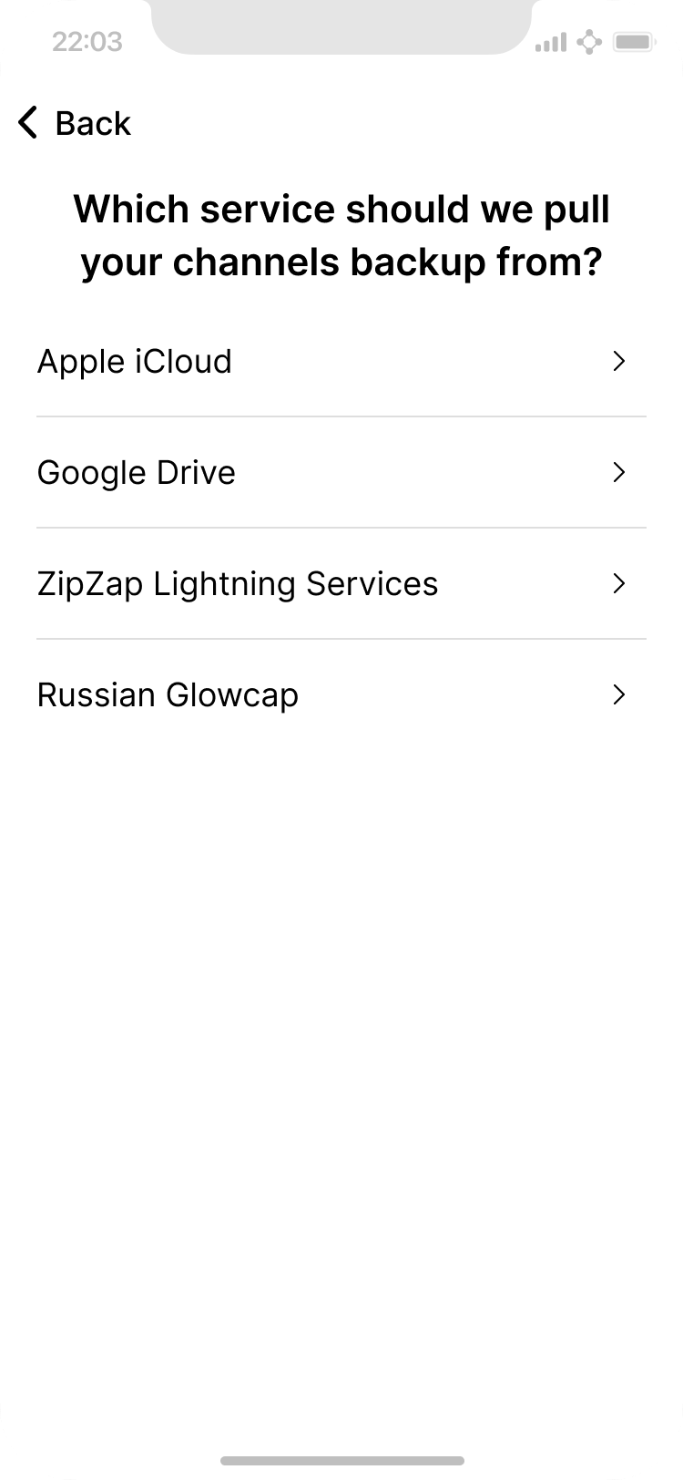 The app fails to automatically find a channel state backup in the user’s cloud account. User chooses to try another cloud account.