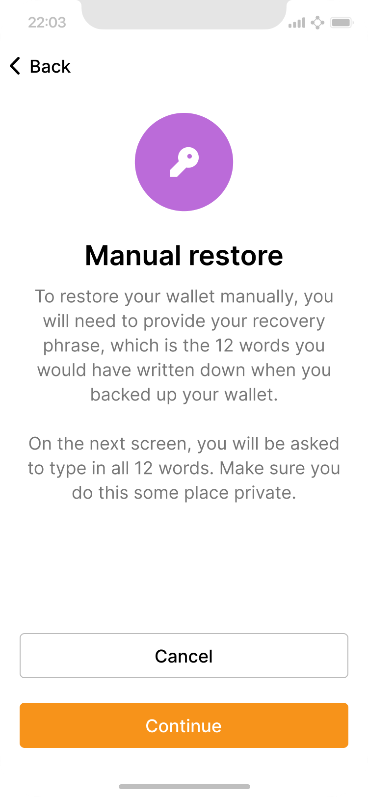 User enters their recovery phrase. The app can autocomplete words for the user.