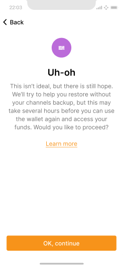 A more complicated and unlikely scenario is one in which the channel’s backup has gotten corrupted in the user’s cloud account or deleted somehow. In this situation, the LSP can force close the channels for the user. This would send the user’s funds to an on-chain address. Once those funds are confirmed on-chain, the wallet will then automatically use those funds to open fresh channels with the LSP for the user. However, this will take some time, so the wallet is very clear in letting the user know that this will take longer.