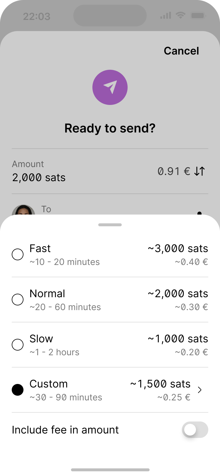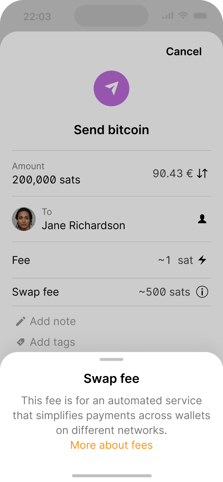 Let’s take a look at how fees surface in a regular send flow, and how users can quickly pull up additional details.