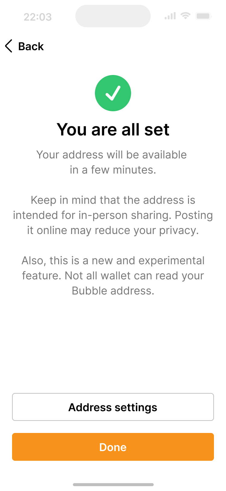 Important: Human-readable addresses should only be used for direct communication. Whenever payment information is communicated digitally (copy & paste, links, QR codes, messaging, etc), cryptographic formats should be used for the best security and privacy.